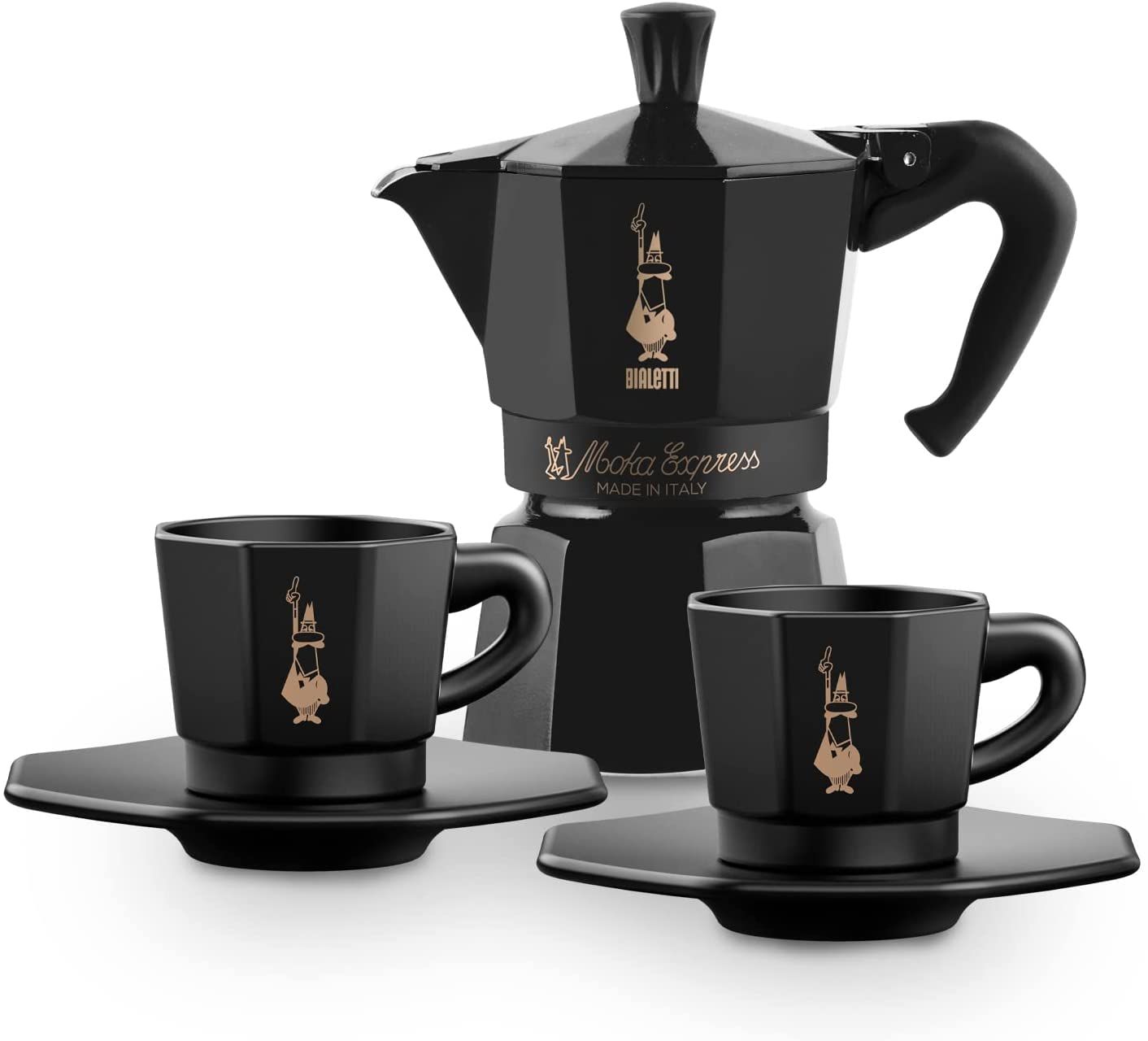 Moka Express Blackstar Edition ● El juego de regalo incluye 3 tazas de Moka Express negro mate y 2 tazas y platillos Diseño elegante con logotipo dorado en negro con una textura elegante que reduce el brillo. El expreso moca es una taza y un platillo que imita la característica forma octogonal, se ha prestado atención al detalle. La unidad principal está equipada con un diseño de mango ergonómico y una válvula de seguridad patentada. Este juego incluye una cafetera de espresso de llama abierta (Makinetta) y una taza que es segura para principiantes. No solo se puede utilizar para el uso diario, sino que también viene en una caja de regalo, por lo que es el regalo perfecto para alguien especial.