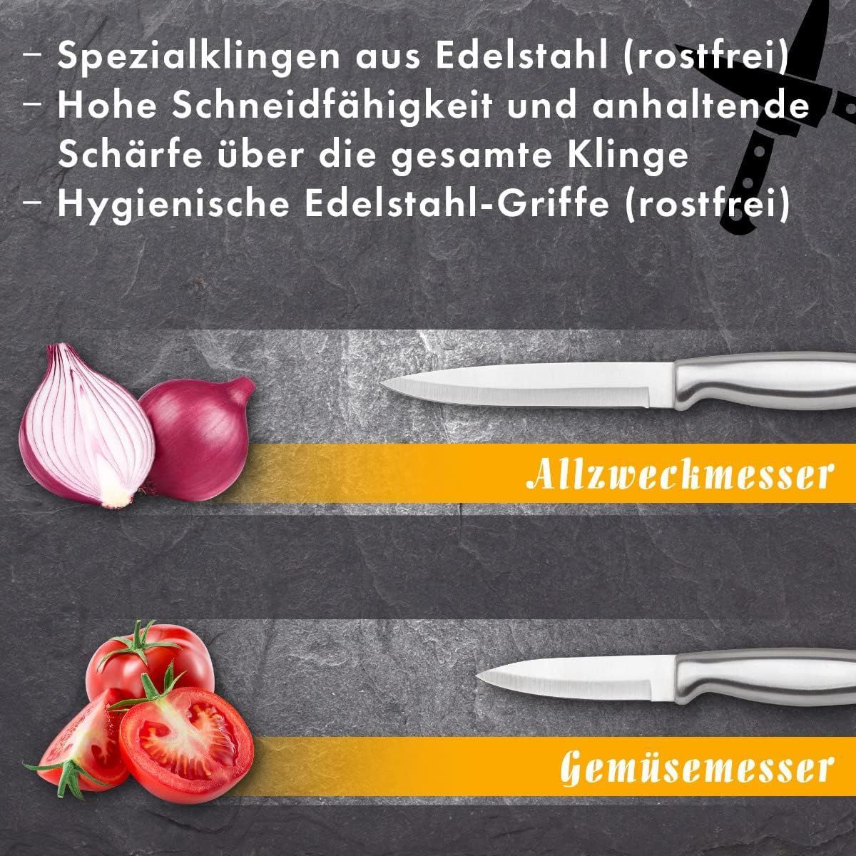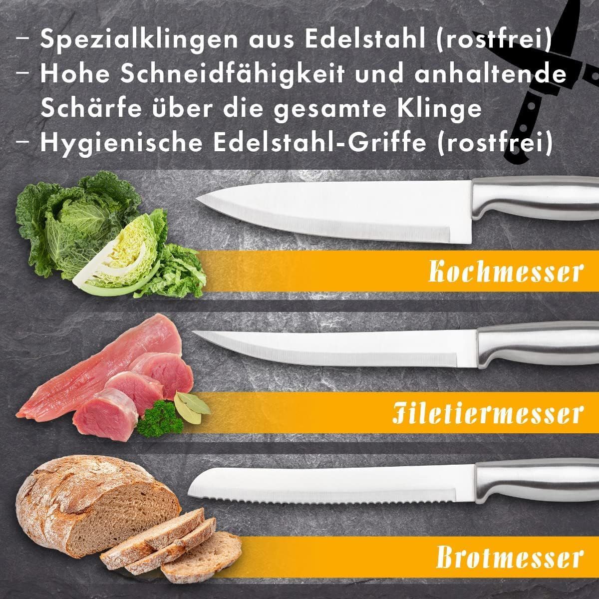 Todo lo que necesita para cocinar: el juego de cuchillos con bloque consta de 1 cuchillo de chef, 1 cuchillo fileteador, 1 cuchillo de sierra para pan, 1 cuchillo multiusos, 1 cuchillo para pelar y unas tijeras multiusos