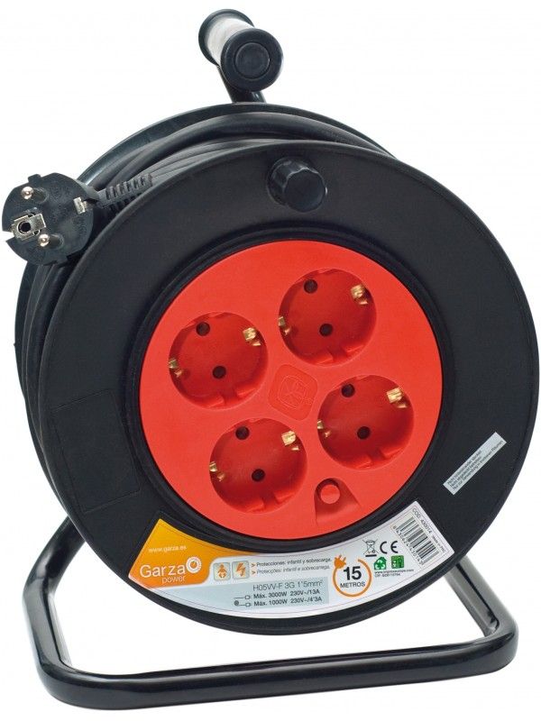 Desenrollado: Máx 3000 W, 10 A / 230 V Enrollado: Máx 1000 W, 4,3 A / 230 V Número de tomas Schuko: 4 Sistemas de protección: Protección infantil Protección de sobrecarga Cable: HO5VV - F 3G 1.5 mm2 - 15M